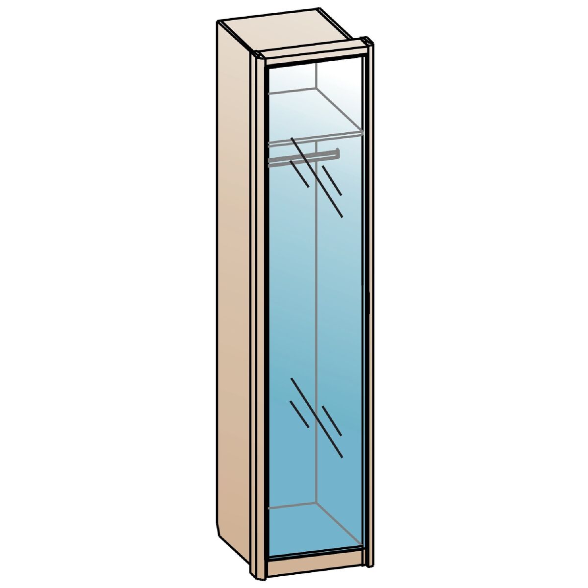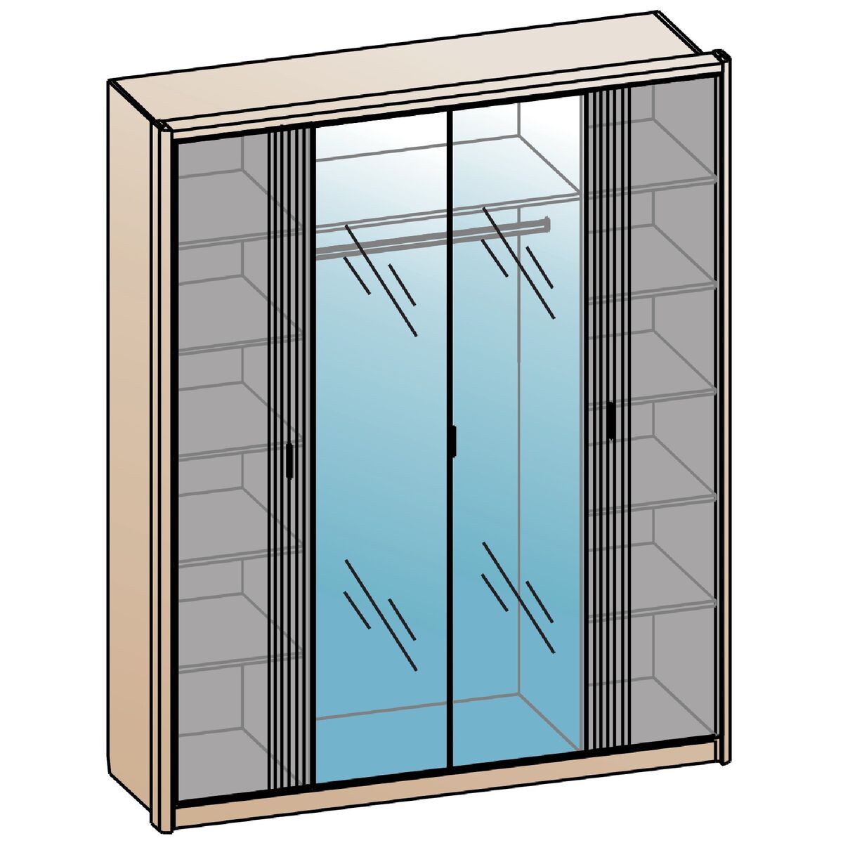 В серии представлены 1, 2, 3, 4-х дверные шкафы и дополнительные угловые модули. Фасады шкафов декорированы зеркалами с обработкой фацет. Высота шкафов составляет 2330 мм, а полезная глубина 568 мм. Шкафы изготовлены из материала ЛДСП 16 мм, задняя стенка из ХДФ. Фасады представлены как в однотонном так и в комбинированном варианте: створки из МДФ 16 мм под пленкой ПВХ Лофт голдэн пэлас, Айрон вуд серебро, Дуб апрель темный, Дуб серый. В комодах, прикроватных тумбах и туалетном столике выдвижные ящики укомплектованы направляющими полного выдвижения. Дно ящика и задняя стенка выполнены из ХДФ, которое вставляется в паз. Фрезерованные крышки из ЛДСП 32 мм облицованы кромкой ПВХ толщиной 1 и 2 мм. Зеркало в овальной форме для туалетного столика комплектуется отдельно. Кровать изготовлена на новой платформе ???????с более прочной конструкцией, мягким или жестким основанием толщиной 32 мм или 16 мм. Изголовье кровати состоит из трех мягких подушек обтянутых микровелюром. Завершающие оригинальные боковые элементы изголовья кровати планки толщиной 32 мм. Кровать представлена в двух вариантах: - с подъемным механизмом (укомплектована анатомической решеткой и вместительным бельевым ящиком внутри) - КРП - без подъемного механизма (укомплектована анатомической решеткой) - КР.